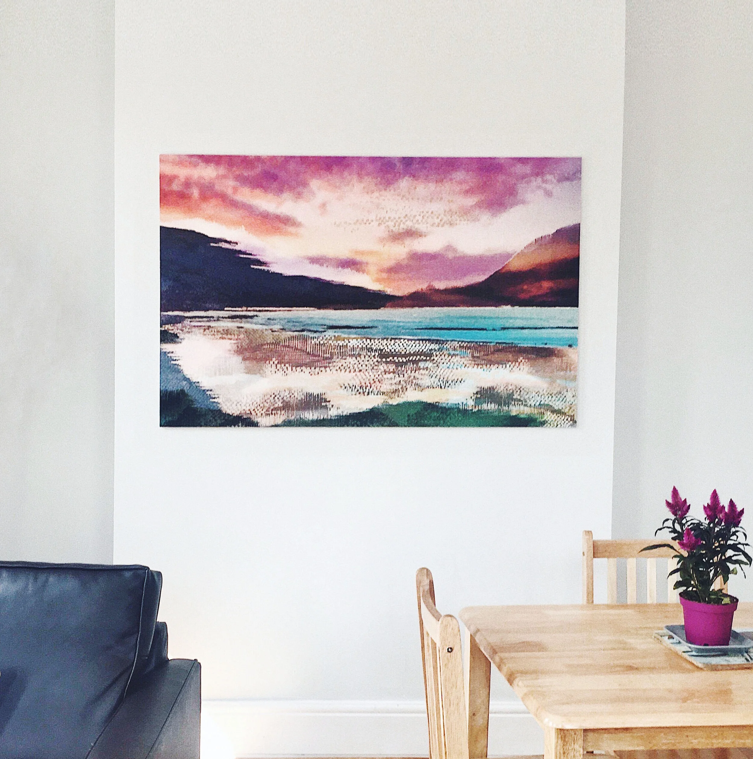 Landscape inspired by Lyme Regis and the Dorset coast. Digital collage of mark making and textures. 120 x 70cm Canvas Print